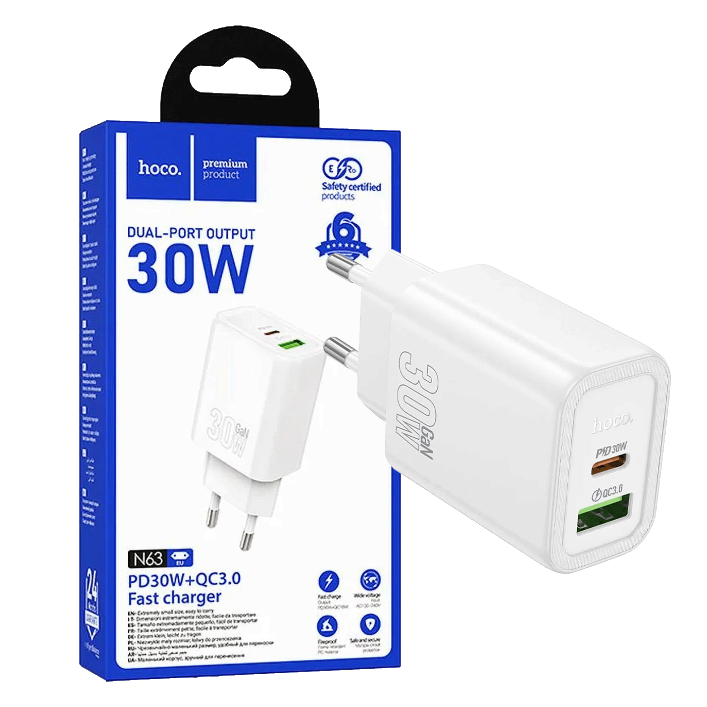 Hoco N63 zidni punjač s funkcijom brzog punjenja i dvostrukim izlazom. Omogućuje munjevito punjenje mobilnih uređaja. Punjač je opremljen dvostrukim izlazom: USB -C (30 W) i USB -A (18 W) omogućuje punjenje 2 uređaja istovremeno. Proizvod podržava PD, QC 3.0, FCP, AFC i druga rješenja za brzo punjenje. Izrađen od PC-a, punjač je iznimno izdržljiv i otporan na oštećenja. Inteligentno prepoznavanje omogućuje vam da struju uskladite s određenim uređajem, osiguravajući sigurnost korištenja. • Priključci: USB -C, USB -A • Ukupni izlaz: 5V/3A •Snaga: – USB -C 30W (PD, QC 3.0, FCP, AFC) – USB -A 18W (QC 3.0, FCP, AFC) • Materijal: PC (otporan na vatru) • Dimenzije: 83 x 39,5 x 26,5 mm • Težina: 70g • Podrška za tehnologiju brzog punjenja: PD, QC 3.0, FCP, AFC garancija 12 mjeseci